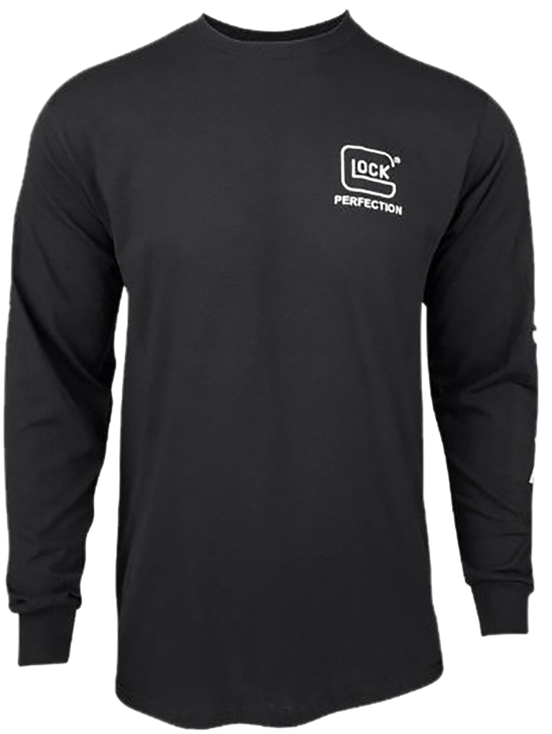 Black pre-shrunk cotton long sleeve t-shirt featuring the Glock Perfection logo. Available in size Large with dimensions 12.2" L x 10.3" W. Designed as casual apparel for firearm enthusiasts and Glock owners.