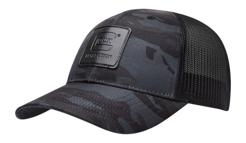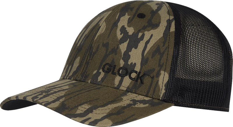 Glock branded baseball cap in Bottomland camouflage pattern featuring a canvas and mesh construction for breathability and durability. One size fits all (OSFA) with adjustable snapback closure for a customizable fit. Ideal for range days, outdoor activities, or casual wear for Glock enthusiasts.