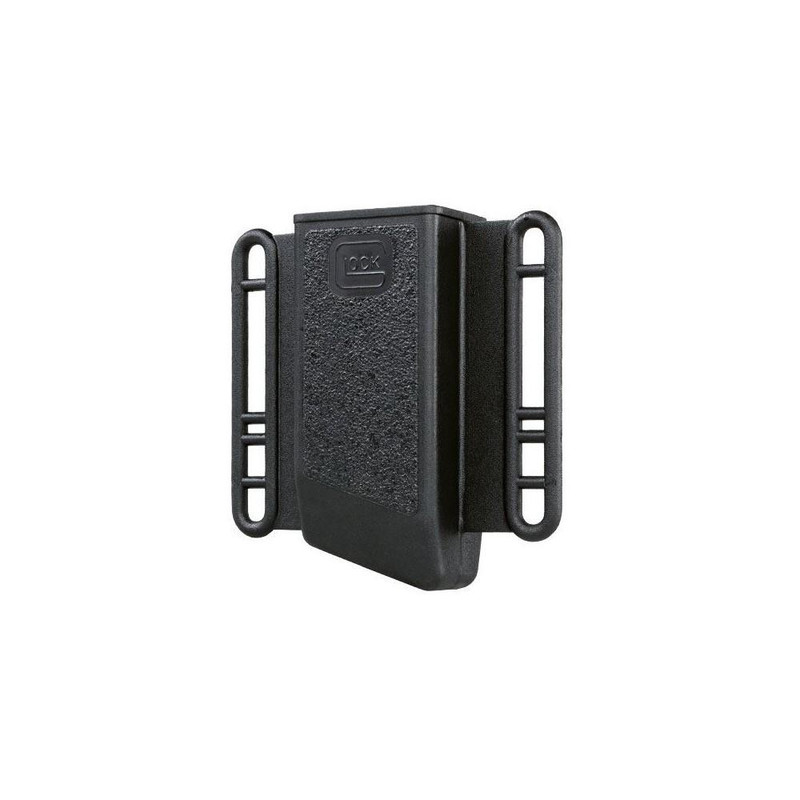 Glock factory-manufactured single magazine pouch designed for Glock 17, 19, 23-37 series pistols. Constructed from durable polymer material in black finish. Includes manufacturer's limited warranty and complies with California Prop 65 requirements.