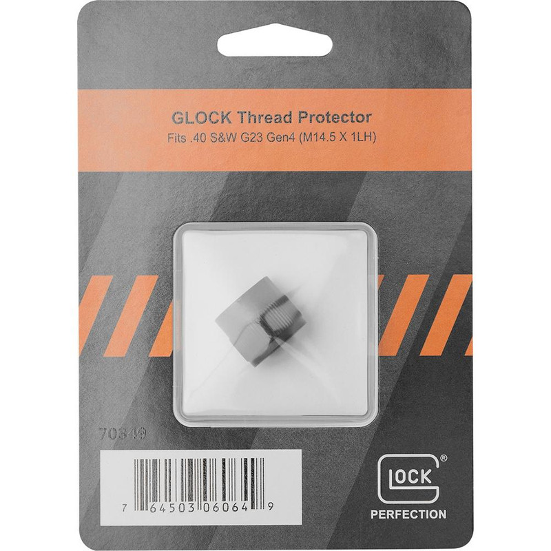 Glock factory-original thread protector designed for .40 S&W G23 Gen 4 handguns with M14.5x1 left-hand threaded barrels. This protector prevents debris accumulation and protects the barrel threads when a suppressor or muzzle device is not installed. Comes as a single unit in original Glock packaging.