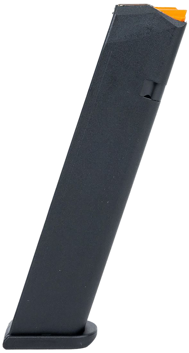 Factory original Glock Gen5 magazine chambered in 9mm Luger with 24-round capacity. Features hardened steel insert encased in high-tech polymer construction with orange follower and witness holes for enhanced durability and visibility. Compatible with Glock 17, 19, 26, 34, and 45 models.