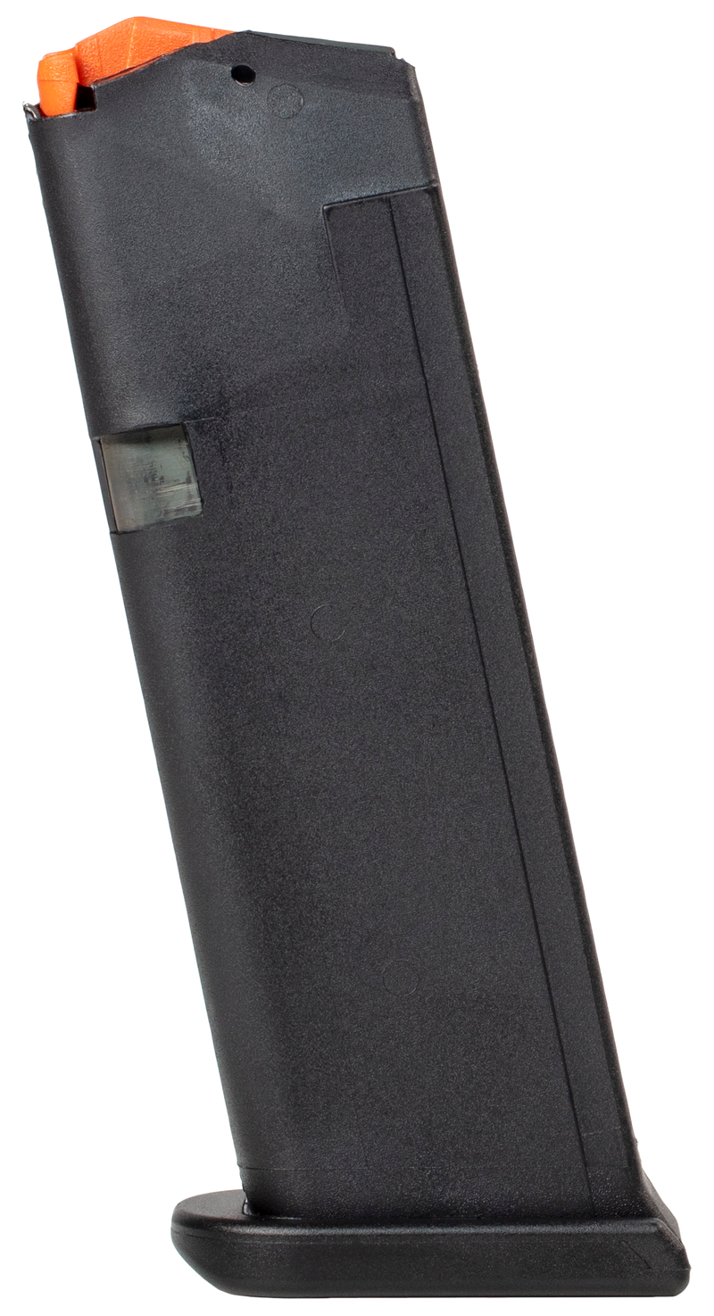 OEM Glock magazine chambered in .40 S&W with 10-round capacity, designed for Glock 23 Gen5 pistols. Features black polymer construction with orange follower and comes packaged. Note: New Glock magazines may require a break-in period before accepting the final round.