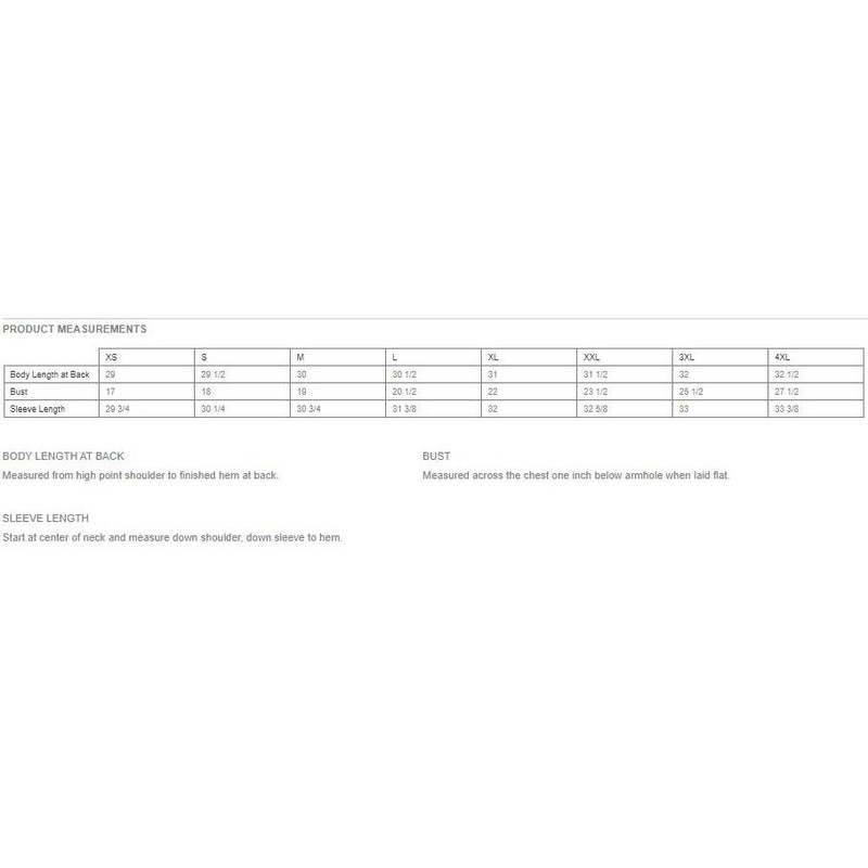 Women's long sleeve lightweight tunic shirt featuring a longer cut with curved hem and tear-away tag. Made from a blend of 50% polyester, 25% combed ring spun cotton, and 25% rayon for comfort and durability.