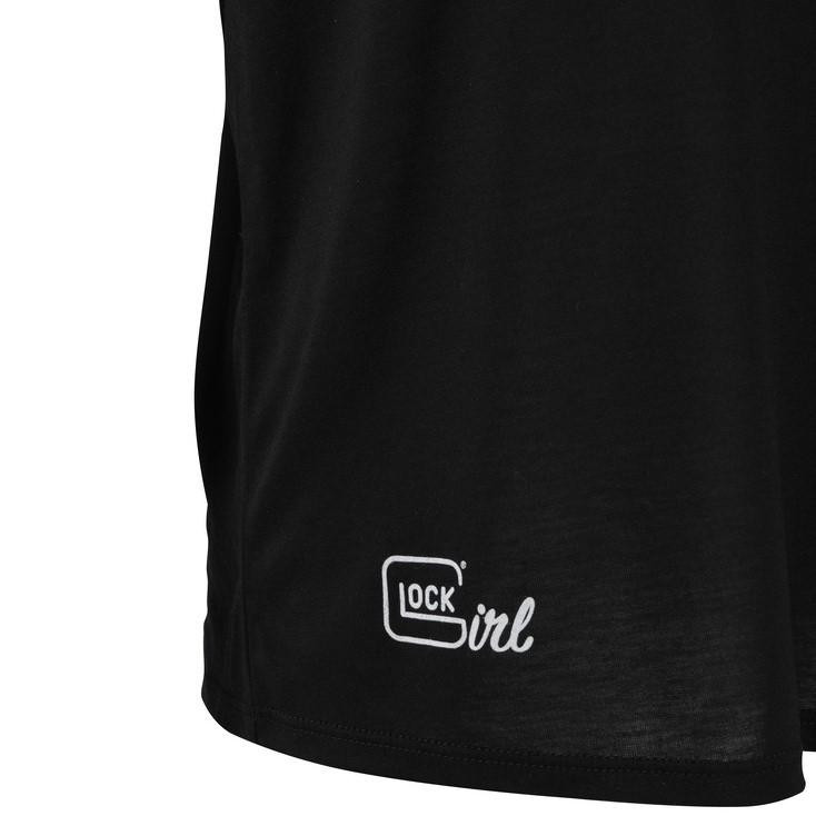 - Design: V-neck relaxed fit with GLOCK Girl logo on right hip and GLOCK pistol silhouette on back nape
