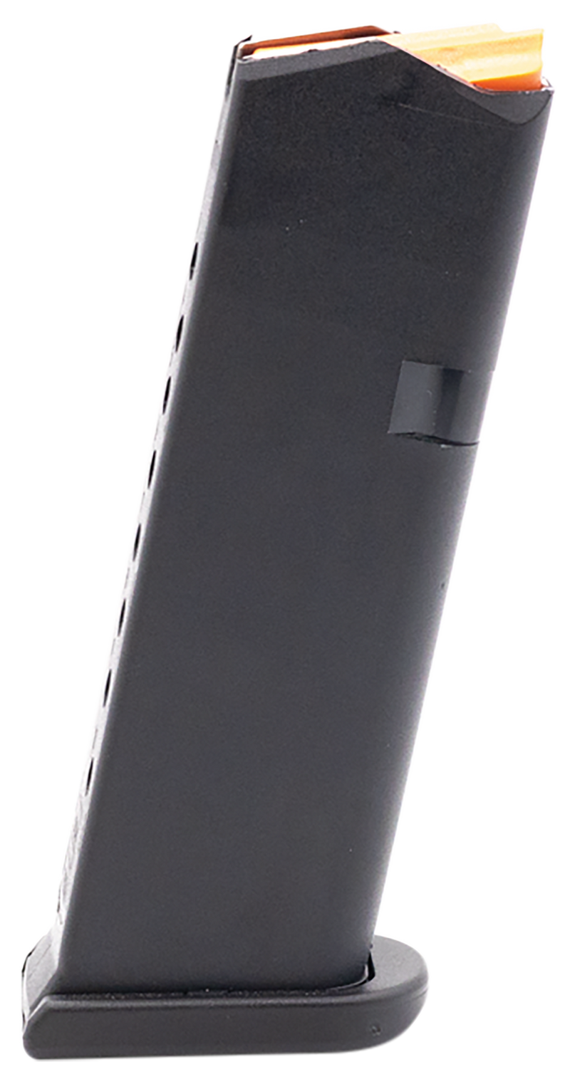Factory Glock OEM magazine for the G43X and G48 9mm Luger pistols with 10-round capacity. Features ambidextrous cuts, high-visibility orange follower, durable polymer construction with steel insert, and witness holes for round count visibility.