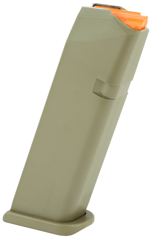 Glock OEM factory magazine chambered in 9mm Luger with 24-round capacity. Features FDE polymer finish with orange follower and fits Glock 17/34 models. Note: New Glock magazines may require a break-in period before loading to full capacity.