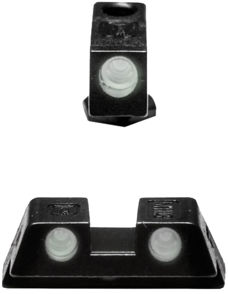 OEM Glock night sights featuring contrasting tritium inserts for accurate target alignment in low-light conditions. Steel construction with 6.5mm rear sight size. Compatible with Glock models 17, 17L, 19, 22, 23, 24, 26, 27, 33, 34, 35, 37, 38, and 39.