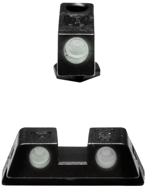OEM Glock night sights featuring contrasting green tritium inserts for accurate target alignment in all light conditions. Designed as a rear sight set with 6.1mm slim profile, compatible with Glock 42 and 43 pistols. Steel construction with California Prop 65 compliance.