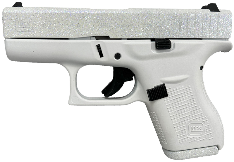 This Glock G42 Gen3 is chambered in 380 ACP with a 3.25" barrel and striker-fired action, offering a 6+1 round capacity. The pistol features a serrated steel slide with frost glitter Cerakote finish, frost Cerakote polymer frame, and textured polymer grips for control. Dimensions are 10.7" length x 9.5" width x 2.3" height, with a firing pin and trigger block safety system.