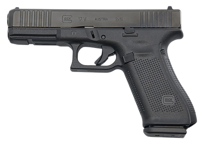 The Glock 17 V is a striker-fired semi-automatic pistol chambered in 9mm Luger with a 4.49" Glock Marksman Barrel and nDLC finish. This full-size duty pistol features fixed sights, front serrations, ambidextrous slide stop lever, flared magazine well, and includes three 10-round magazines. The polymer frame with accessory rail and interchangeable backstraps accommodate both left and right-handed operators.