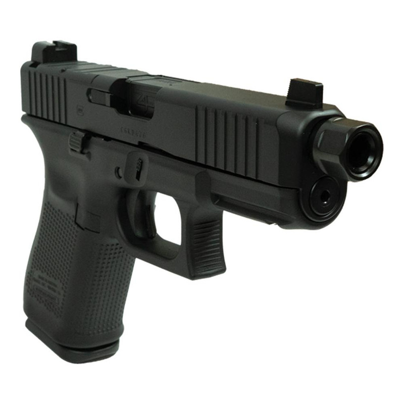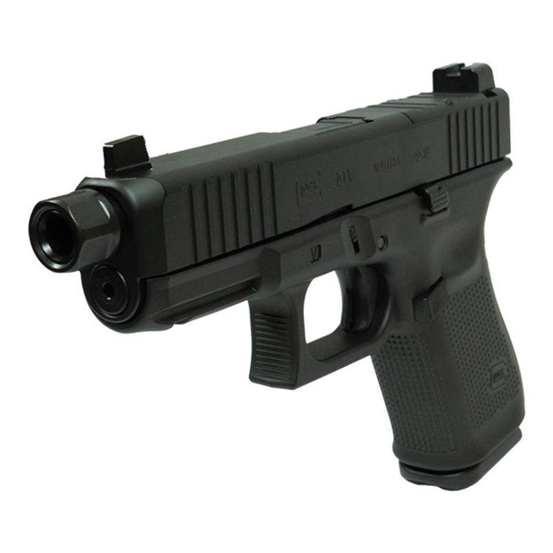Semi-auto striker-fired pistol chambered in 9mm Luger with a 4.6" threaded barrel and 15-round capacity. Features RMR optic-ready cut, black Cerakote finish, ambidextrous slide stop, and flared magwell. Includes three magazines and represents Glock's V-Series design with improved internal safety and performance upgrades.