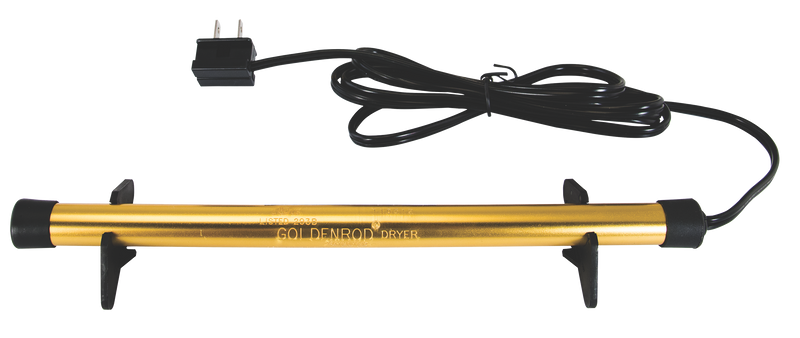 The Golden Rod Dehumidifier eliminates humidity, mildew, and condensation inside gun safes and enclosed storage by gently warming and circulating air. This 12-inch rod is made in the USA, includes mounting brackets, and plugs into standard 110/120V AC outlets to protect firearms from rust and moisture damage. It is designed for enclosures up to 100 cubic feet.