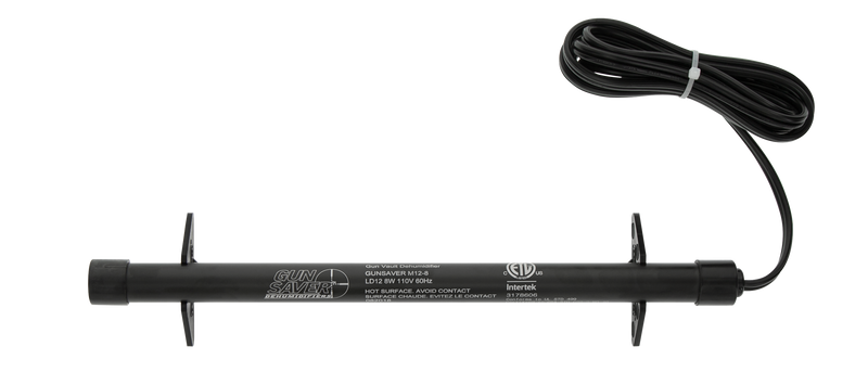The Gun Saver Dehumidifier Rod removes moisture from gun safes and enclosed storage by gently warming air circulation to eliminate humidity, mildew, and condensation that can damage firearms. This 12-inch rod features a quick plug attachment with 110-volt outlet power and easy mounting bracket installation. Designed to protect firearms from rust and corrosion in storage environments.