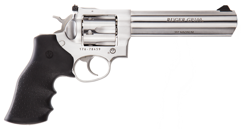 The Ruger GP100 is a double/single action revolver chambered in .357 Magnum with a 6-inch heavy barrel and 6-round capacity. Features a satin stainless steel finish, Hogue Monogrip, adjustable rear sight with ramp front sight, and transfer bar safety mechanism. Weighs 45 ounces with an overall length of 11.5 inches and includes a hard plastic case.