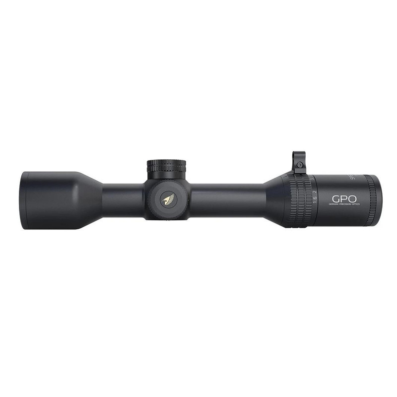 The GPO Spectra 1.6-13x44i is a compact 30mm tube rifle scope featuring variable magnification with an illuminated G4i reticle for versatile target engagement. It offers 126 ft windage and elevation adjustment, 3.5" eye relief, and is fully waterproof with a multi-coated optical system. The scope includes a removable throw lever, capped zero resettable turrets, and operates on a CR2032 battery.