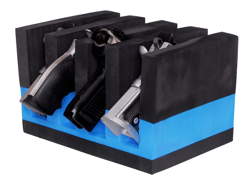 Foam pistol cradle designed to safely store and organize up to 4 handguns. Features a compact footprint with dimensions of 16.0" L x 11.0" W x 6.4" H, making it suitable for gun safes, cases, or storage racks. Constructed from durable foam material to protect firearms from damage.