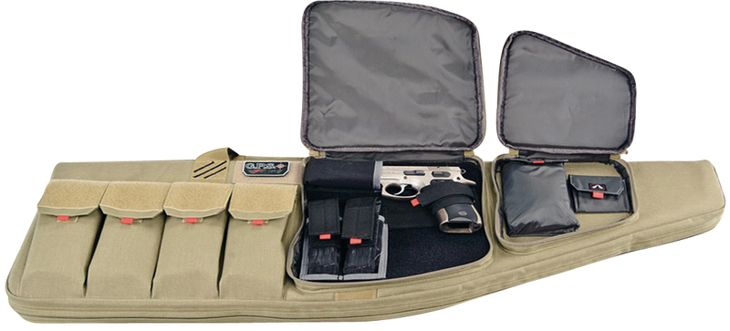 This 42-inch tactical rifle case is designed to hold one AR-platform rifle with dedicated storage for magazines and accessories. Features include 1000D polyester construction, lockable YKK zippers, padded interior, an external handgun pocket, and a visual ID storage system for quick identification.