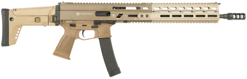 Semi-automatic aluminum frame pistol chambered in 9mm Luger with a 5" threaded barrel (1/2x28) and 30+1 round capacity. Features ambidextrous manual safety, non-reciprocating charging handle, M-LOK rail system, and iron sights. Includes three magazines and matte flat dark earth finish.