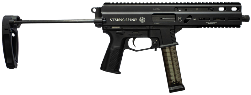The Grand Power Stribog SP10A3 is a semi-auto pistol chambered in 10mm Auto with an 8" threaded barrel and 20+1 round capacity. It features a black aluminum Picatinny rail receiver, polymer PDW Tailhook brace, ambidextrous safety lever, and iron sights. Dimensions are 19.4" L x 12.0" W x 4.4" H with a black polymer grip and includes a thread protector.
