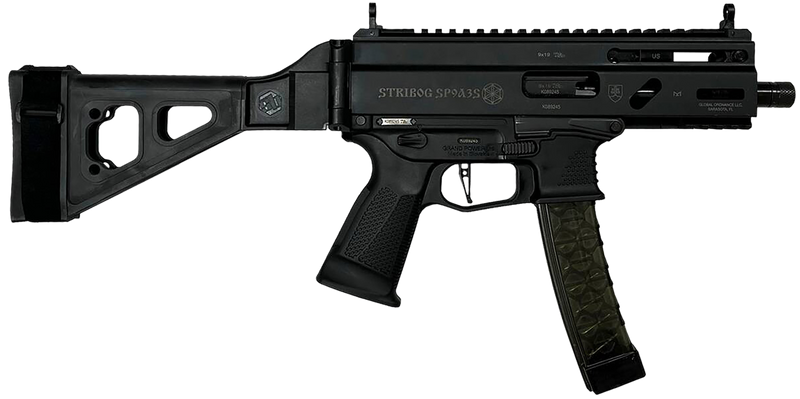 The Grand Power Stribog SP9A3S is a 9mm semi-automatic striker-fired pistol with a 5" threaded barrel (1/2x28 thread pitch) and 30-round capacity, featuring a folding SB Tactical brace, M-LOK handguard, and ambidextrous controls. Built on an aluminum frame with a roller-delayed blowback operating system, it ships with 3 magazines and iron sights for immediate use. The matte black finish and Picatinny rail receiver make it customizable for optics and accessories.