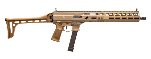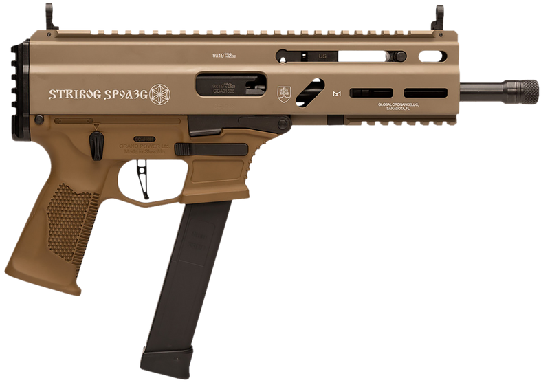 The Grand Power Stribog SP9A3G is a 9mm semi-automatic pistol with an 8" threaded barrel and 30+1 round capacity. Features include an M-LOK handguard, ambidextrous safety lever, iron sights, and a flat dark earth cerakote aluminum/polymer receiver with Picatinny rail. Compatible with Glock-style magazines and includes 3 magazines with hard case.