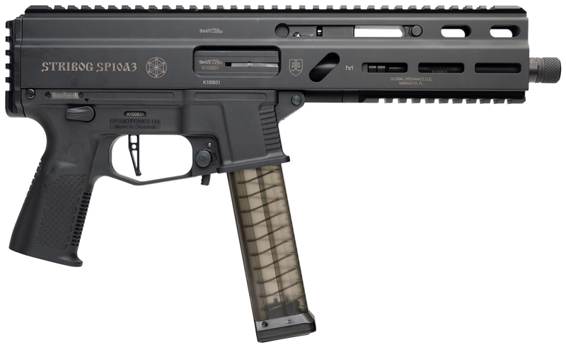 The Grand Power Stribog SP10A3 is a semi-automatic pistol chambered in 10mm Auto with an 8" threaded barrel and hardcoat anodized aluminum/polymer receiver. It features a non-reciprocating charging handle, M-LOK rail system, Picatinny top and rear rails, ambidextrous safety controls, and ships with 3 magazines and a hard case.