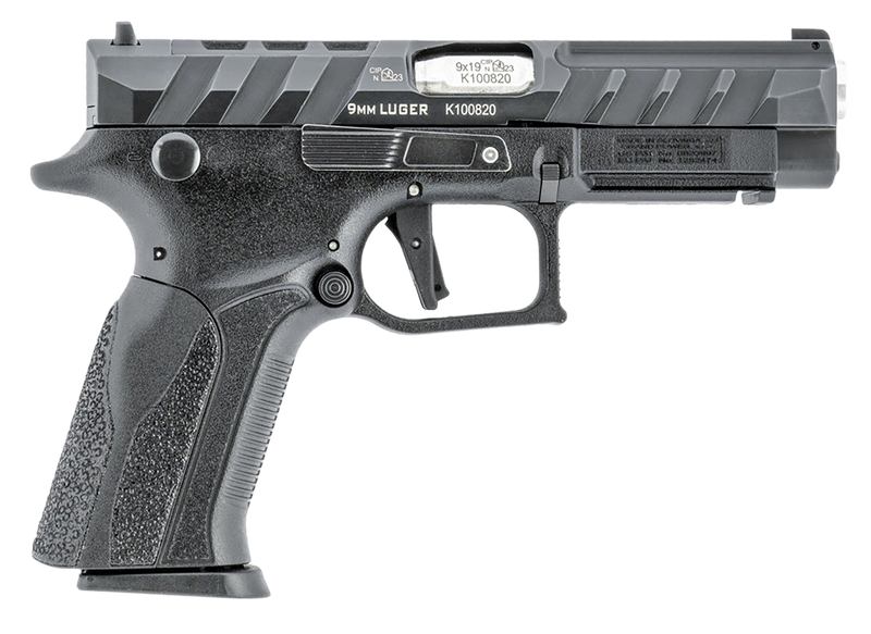 Grand Power Q100 Mk23 is a 9mm semi-automatic striker-fired pistol with a 4.25" barrel and 15+1 capacity. Features an optic-ready serrated slide, polymer frame with accessory rail and beavertail, textured grip, and includes 4 optic adapter plates and 3 magazines. 3-dot sights and trigger safety.
