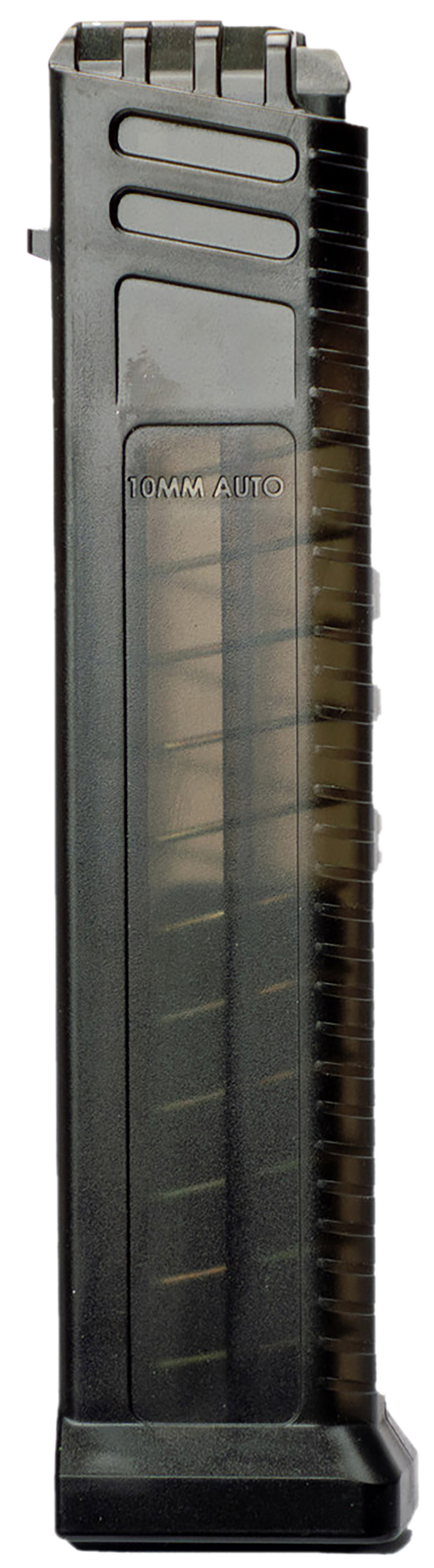 Grand Power magazine for the Stribog SP10A3 pistol in 10mm Auto with 10-round capacity. Features a translucent smoke polymer construction for easy round count visibility. Dimensions: 10.3" length x 3.8" width x 1.6" height.