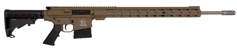 Semi-automatic AR-10 platform rifle chambered in .243 Win with a 24" stainless steel threaded barrel featuring 5R rifling and 1:8 twist. Aluminum 7075 receiver with full Picatinny rail handguard, mil-spec polymer grip, adjustable synthetic stock, and included muzzle brake. Weighs 9.25 lbs with no sights installed.