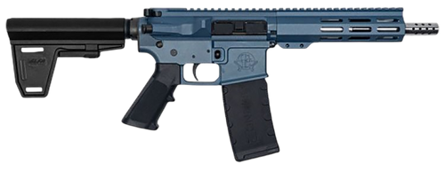 Great Lakes Firearms AR-15 pistol chambered in .223 Wylde with a 7.5" stainless steel barrel and semi-automatic action. Features a billet aluminum lower receiver, forged aluminum upper receiver, 15.25" M-LOK handguard with full top Picatinny rail, mil-spec trigger, and G-Force adjustable pistol brace. Weighs 5 lbs with a 30+1 round capacity and includes a custom muzzle device.