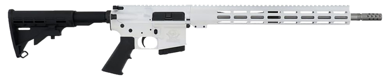 Semi-automatic rifle chambered in .350 Legend with a 16-inch stainless steel threaded barrel and 1:10 twist rate. Features a white Cerakote finish, aluminum 7075 receiver, M-LOK handguard, mil-spec polymer grip, and includes a muzzle brake. Weighs approximately 6.4 lbs with no sights installed.
