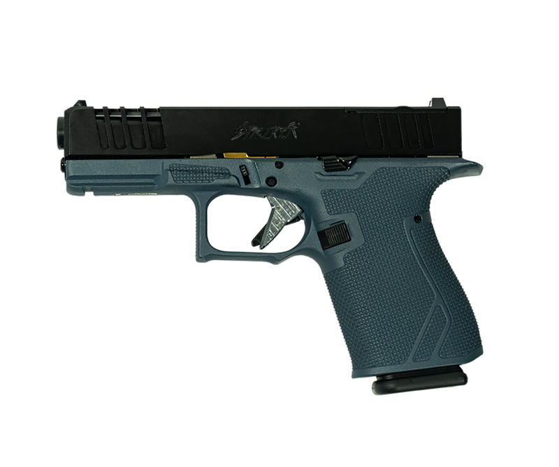 The Great Lakes Firearms GL19 Striker is a 9mm Luger semi-auto compact pistol with a 4" ported barrel, 15+1 round capacity, and optic-ready RMR-compatible slide. Features front and rear slide serrations, ambidextrous magazine release, Cerakote blue titanium finish, and Gen3 Glock-compatible parts.