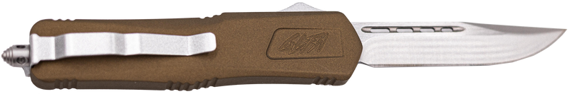 This Great Lakes Firearms GLFA is a medium-sized out-of-the-front (OTF) knife featuring a 3.50" plain steel blade and bronze Cerakote aluminum handle. The knife operates via push button mechanism and has an overall length of 8 inches when fully extended. Designed as a compact, deployable blade tool for general cutting tasks.