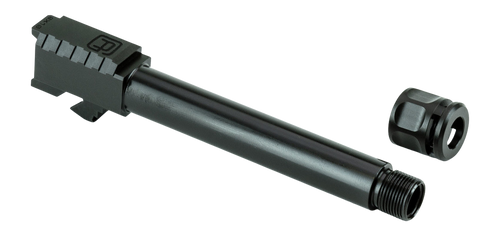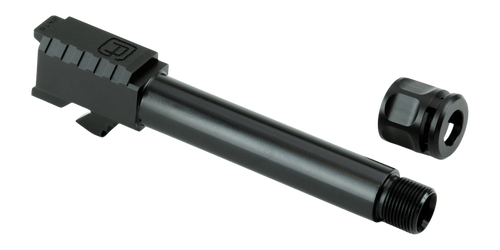 This Griffin Armament ATM is a 4.5" threaded stainless steel barrel designed for Glock 19 Gen 3/4 pistols chambered in 9mm. The barrel features a black nitride finish, 1/2x28 threads, and comes with a Micro Carry Compensator installed for reduced recoil. Simply remove the factory barrel and install this drop-in replacement—no gunsmithing required.