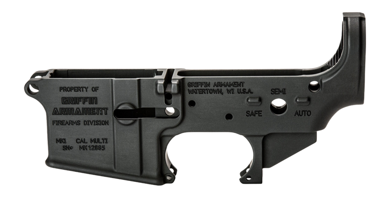 The Griffin Armament MK1 is a stripped AR-15 lower receiver, providing the foundation for building a custom AR-platform rifle. This is the regulated firearm component that requires FFL transfer. Stripped lowers come without trigger group, buffer tube, or stock.