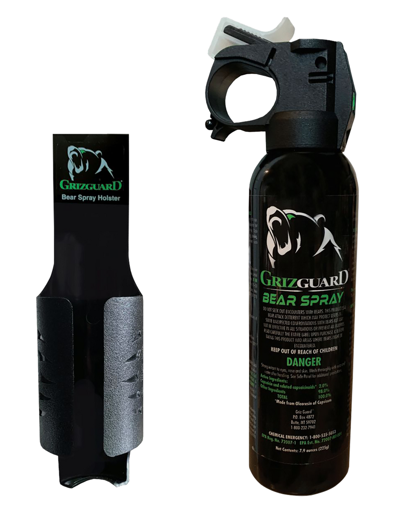 Griz Guard is a bear spray developed by a grizzly bear attack survivor, utilizing a 2% major capsaicinoid formula effective on all bear species. The aerosol spray reaches up to 30 feet and comes with a holster for convenient carry. It is a personal safety tool designed for face-to-face encounters with aggressive bears.