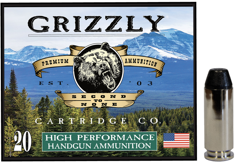 Grizzly Ammo 10mm Auto ammunition loaded with 220-grain full metal jacket flat point bullets. This centerfire handgun round delivers 1200 fps muzzle velocity and 703 ft-lbs of energy, supplied in boxes of 20 rounds.