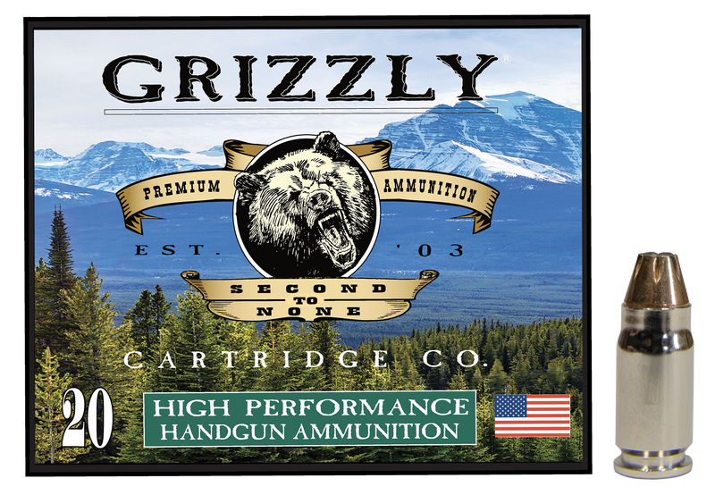 Grizzly Ammo 357 Sig centerfire handgun ammunition featuring 90 grain Jacketed Hollow Point bullets. This round delivers 1900 fps muzzle velocity and 721 ft lbs of muzzle energy, supplied in 20-round boxes with 10 boxes per case.