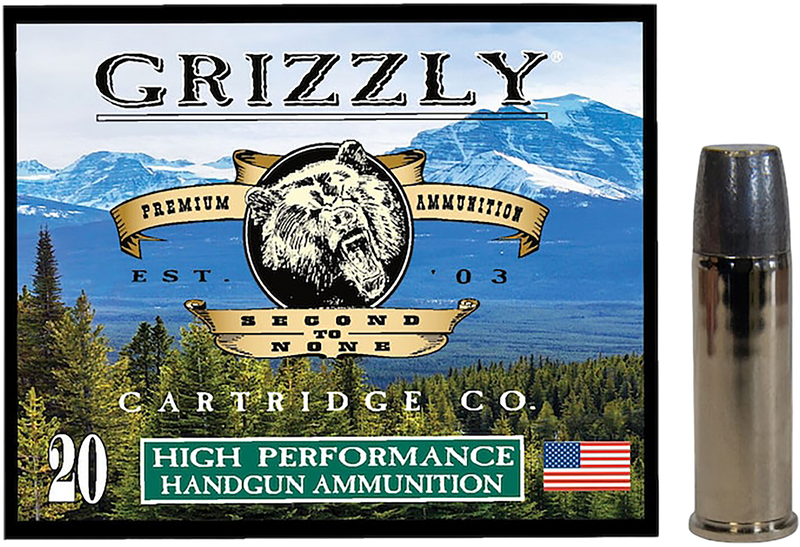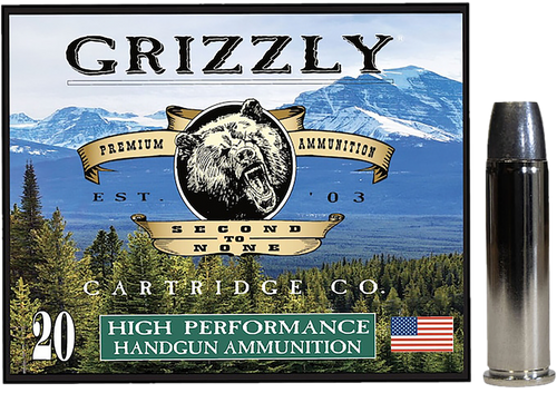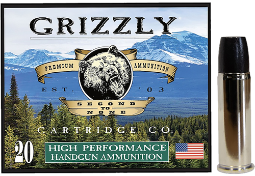 Grizzly Ammo centerfire handgun rounds in 44 Rem Mag with 320-grain wide long nose gas check bullets. Delivers 1350 fps muzzle velocity and 1295 ft-lbs of energy. Sold 20 rounds per box, 10 boxes per case.