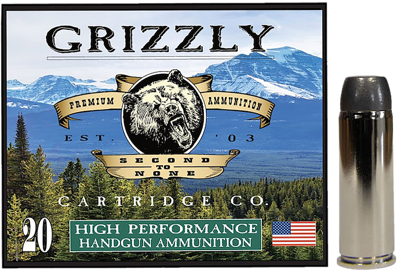 Grizzly Ammo 45 Colt centerfire handgun ammunition loaded with 265-grain Wide Flat Nose gas check bullets. Delivers 950 fps muzzle velocity and 531 ft-lbs muzzle energy, designed for deer and predator hunting applications. Packaged 20 rounds per box, 10 boxes per case.
