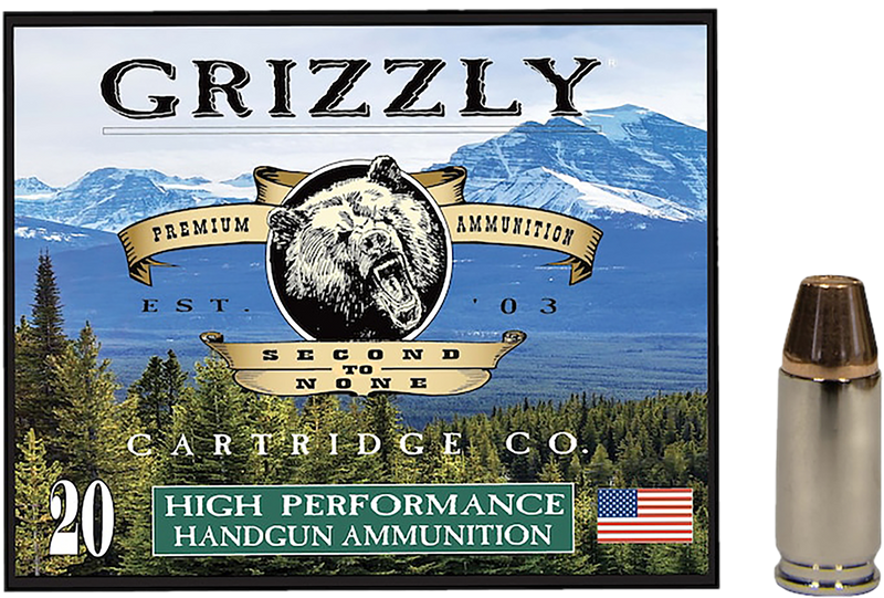 Grizzly Ammo 9mm Luger +P ammunition loaded with 124-grain Full Metal Jacket Flat Point bullets. Muzzle velocity of 1350 fps and muzzle energy of 502 ft lbs, packaged 20 rounds per box with 10 boxes per case. Designed for deer and predator applications.