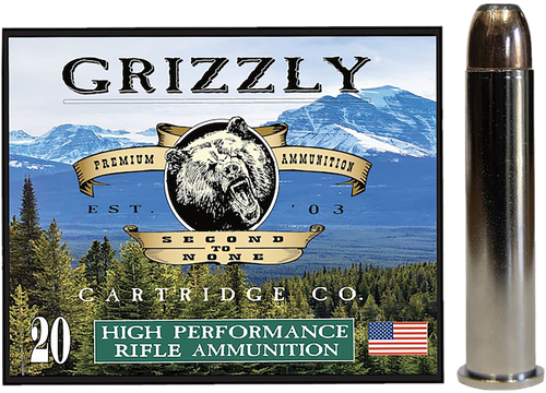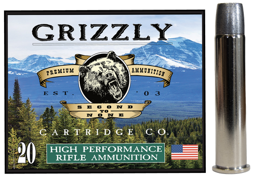Grizzly Ammo 45-70 Gov centerfire rifle ammunition loaded with 410-grain full metal jacket flat point bullets. Delivers 1075 fps muzzle velocity and 1052 ft-lbs of muzzle energy. Sold in 20-round boxes, 10 boxes per case.