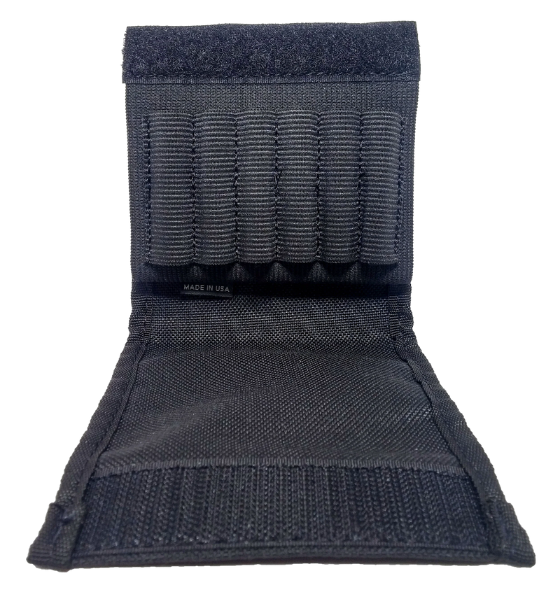 This slip-on buttstock cartridge holder features 6 elastic-sewn loops designed to securely hold rifle ammunition while keeping rounds accessible and protected from the elements. Constructed from durable Cordura material with bar-tack reinforced stitching, it mounts directly onto a rifle buttstock and includes a protective flap. Dimensions are 5.8" L x 4.4" W x 0.6" H.