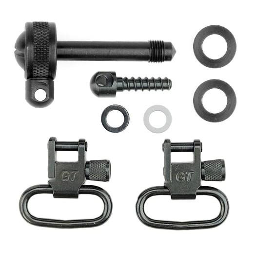 This swivel set is specifically designed for the Remington 7400 and compatible firearms, featuring 1" loops with a black-oxide finish. The kit includes a custom adaptor bolt swivel base with spacers, a 3/4" rear swivel stud with spacer, and one pair of GT Locking Swivels for secure attachment. All necessary hardware is included for installation.