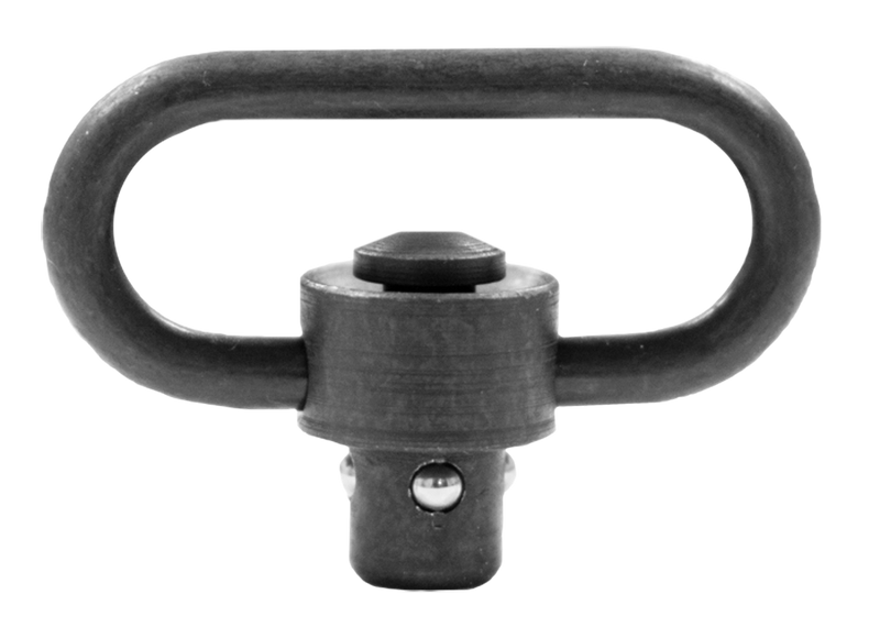 Heavy-duty single push button swivel with 1.5" loops designed for wide slings and tactical applications. Features steel construction with manganese phosphate or black phosphate finish for corrosion resistance. Compatible with standard rifle slings and sling hardware systems.