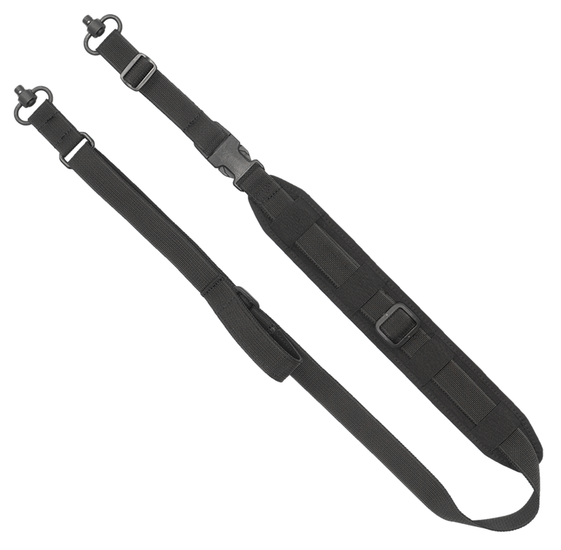 The QS 2-Point Sentinel Sling features 1" wide webbing with a 2" wide shoulder pad and Quick Slide adjustment mechanism for dynamic length changes on the go. It includes heavy-duty push button swivels, an emergency side release buckle, and a tailless design optimized for 2-point carry configuration on rifles and shotguns.