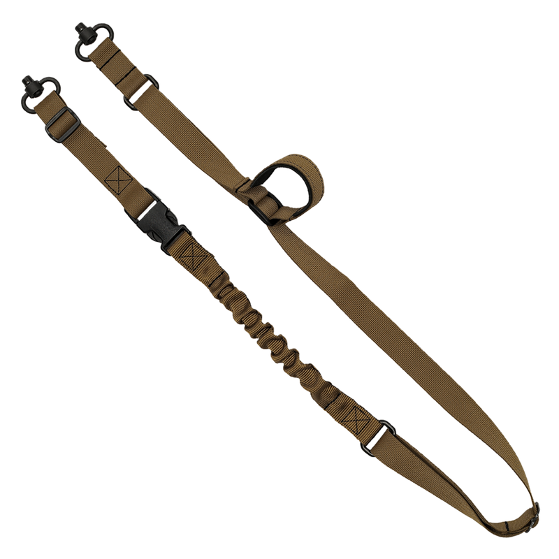 The QS 2-Point Sentry Sling features 1" wide webbing with an integrated bungee cord for flexible, rapid movement. It includes quick-slide adjustment functionality, heavy-duty push button swivels, an emergency side release buckle, and is adjustable to fit various users.
