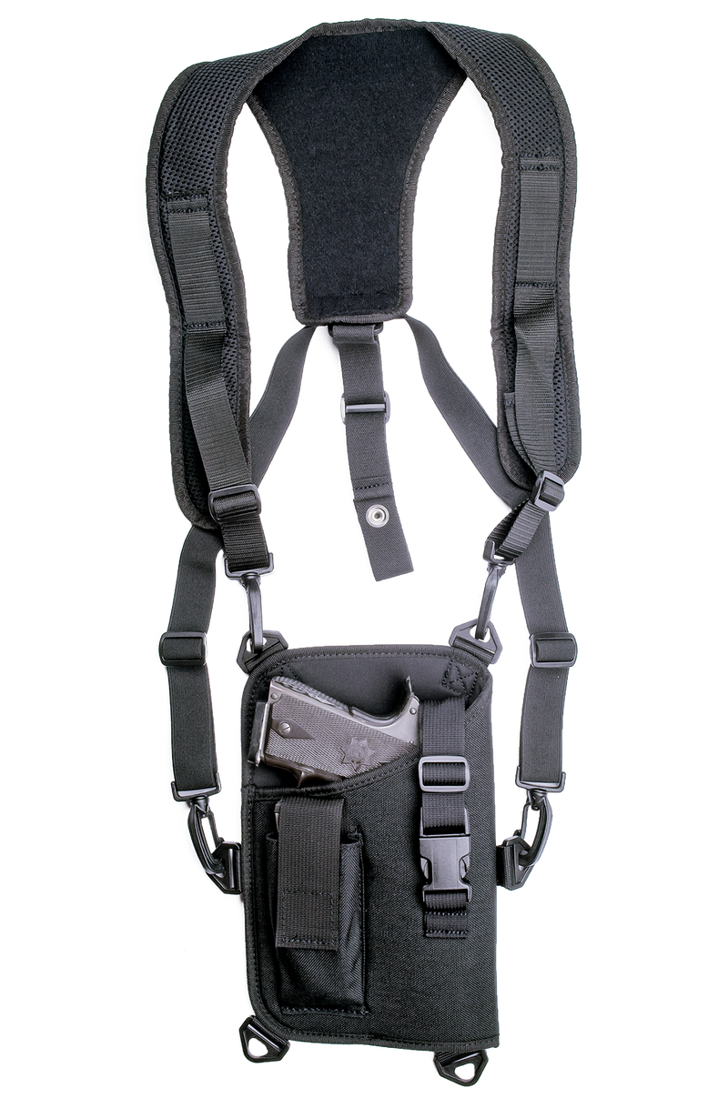 Right-hand shoulder holster system designed for large semi-automatic pistols with 4.50-5" barrels. Constructed from durable 1000D nylon with a harness mount and two compartments for organized carry. Features textured finish for secure retention and comfortable all-day wear.