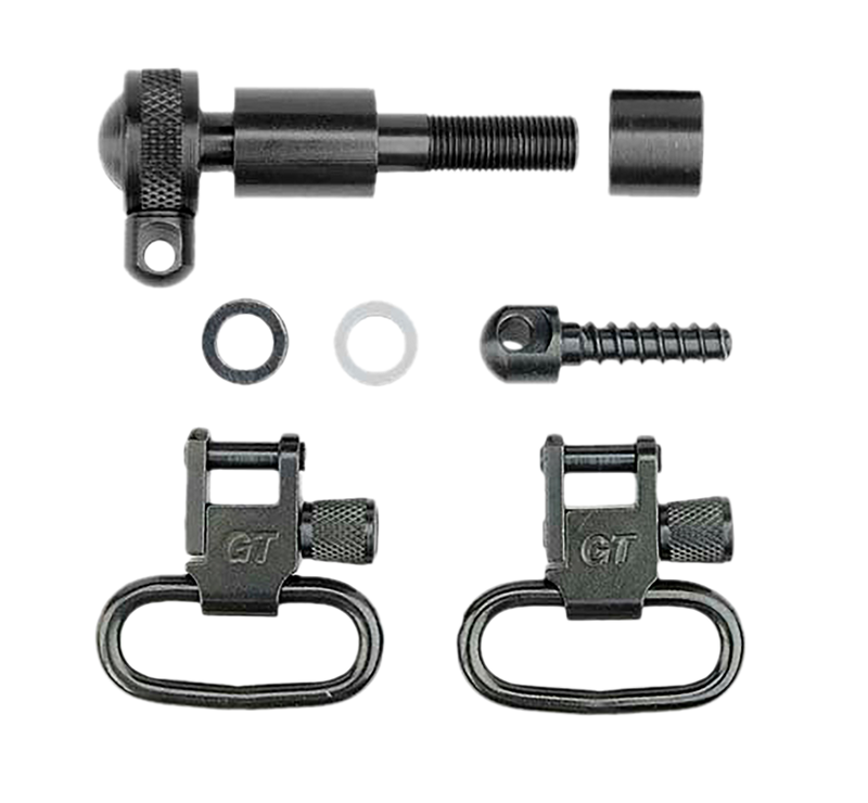Custom exact-fit swivel set designed for Remington 760 (1969-1981) and 7600 (after 1984) rifles. Includes adaptor bolt, spacers, rear wood screw swivel stud, and one pair of GT locking swivels with 1" loops. Black oxide steel construction provides corrosion resistance and secure sling mounting.