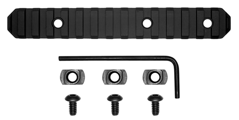 This GrovTec rail section is a 6-inch M-LOK compatible accessory rail made from aluminum with black anodized finish. It features 15 M-LOK slots for mounting tactical accessories and measures 2.7" wide by 0.7" tall, designed to integrate with M-LOK equipped handguards and rail systems.